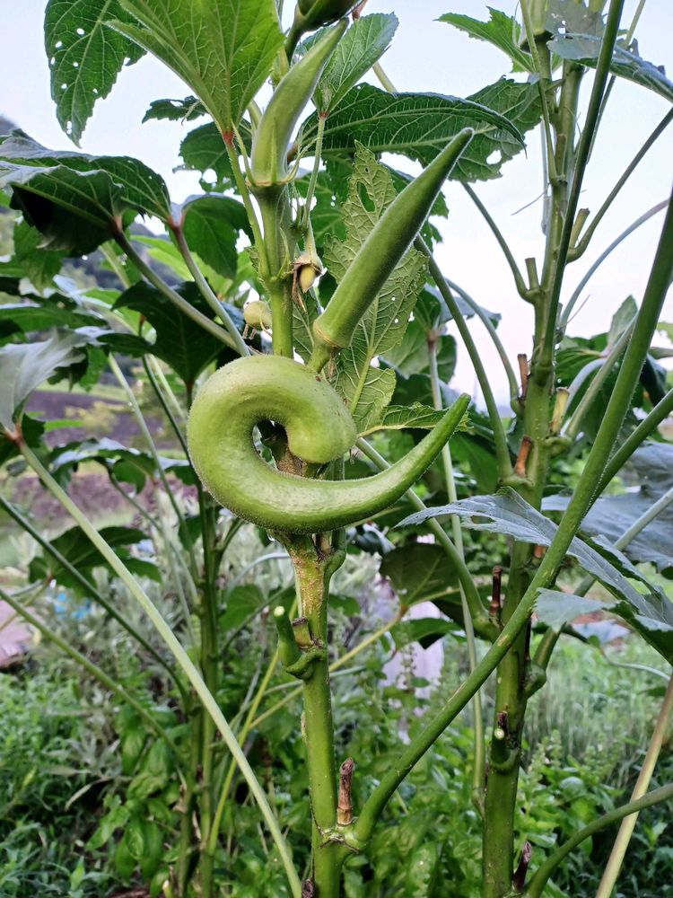 今年の我が家のオクラもカールだらけ。猛暑が影響してるのか🤔。味は変わらないけどね😁。
