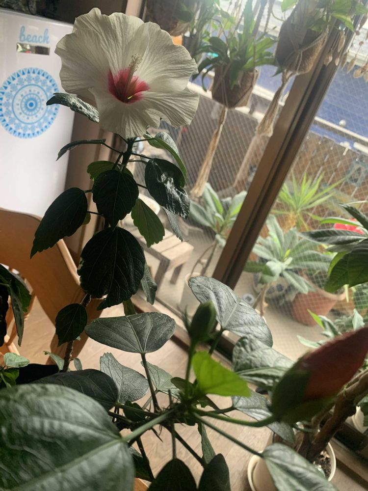 この白いハイビスカスは熱海に両親と旅行に行った時に寄せ植えで最初黄色とオレンジと紫の3色の寄せ植えだって聞いて見切り品をお持ち帰りしてきたのね 最初は黄色い子が咲いてたけど何故か急にその枝から白いこの子が咲き始めたの😵