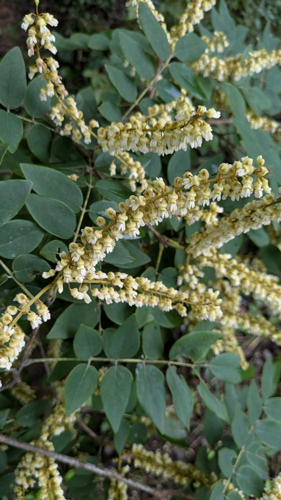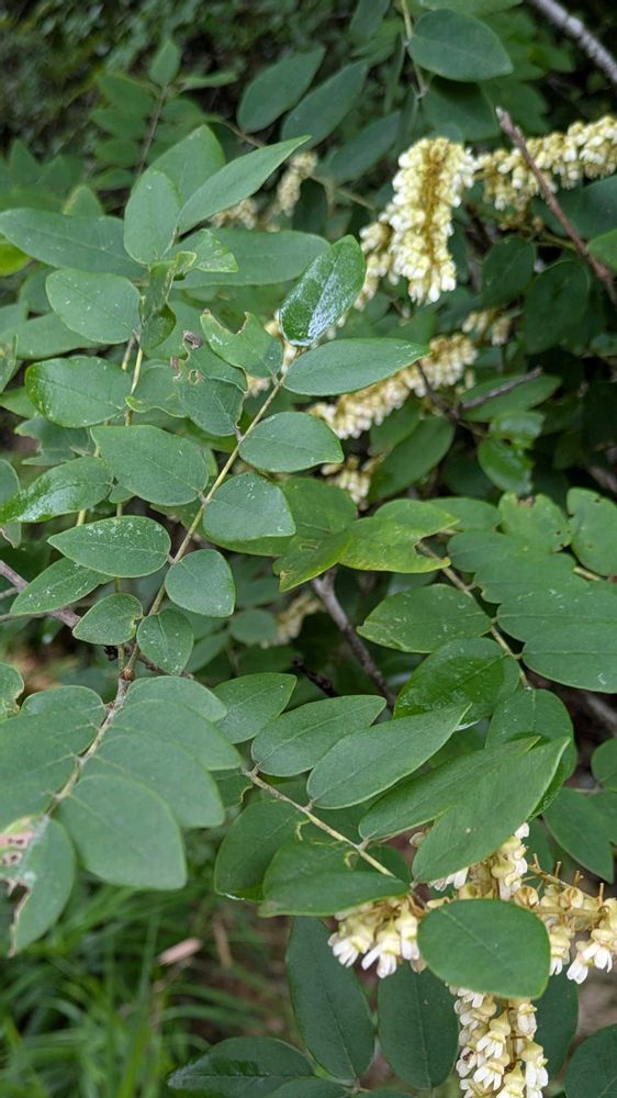 葉をみるとフジやハギと同じ奇数羽状複葉で、マメ科だと分かる🟢
