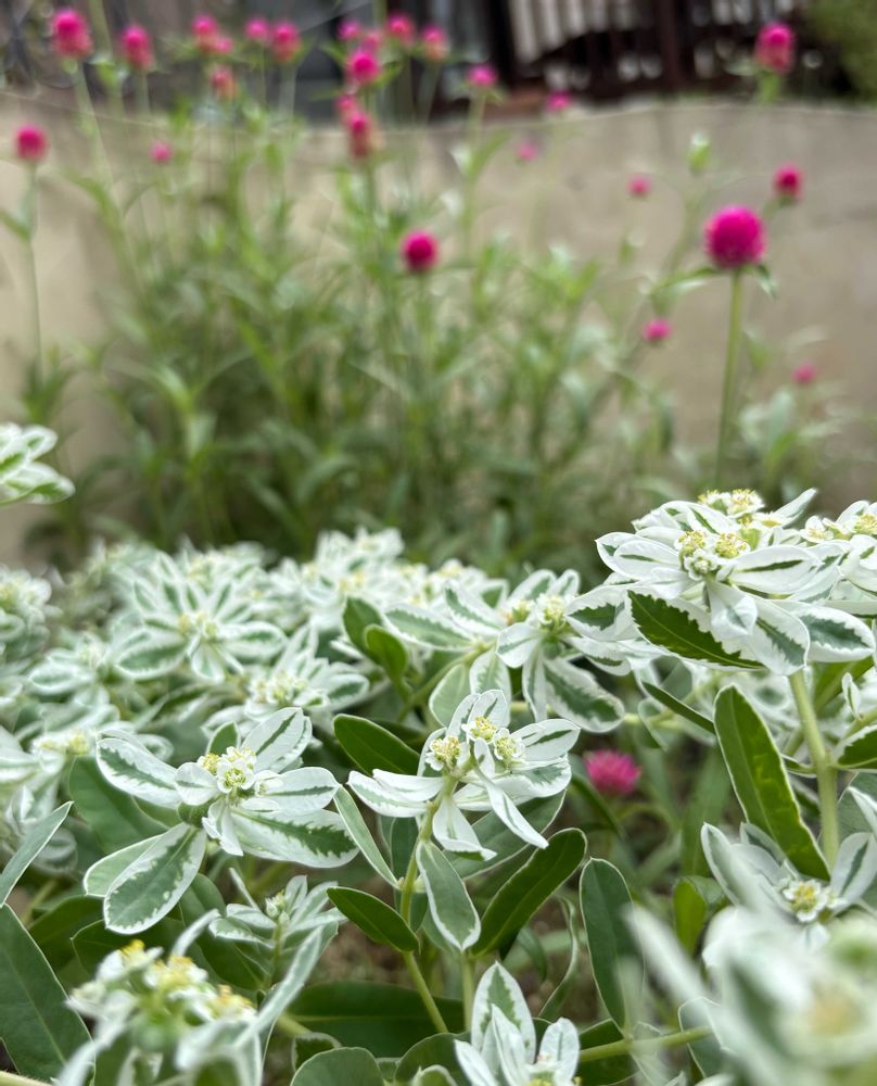暑さで疲れた庭の中で、ハツユキソウと千日紅ラズベリーフィールドが元気です ٩( ˙꒳˙ )ง