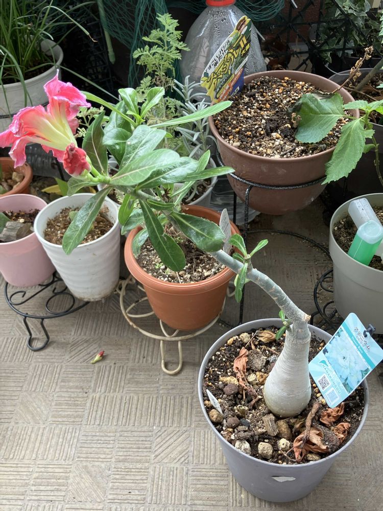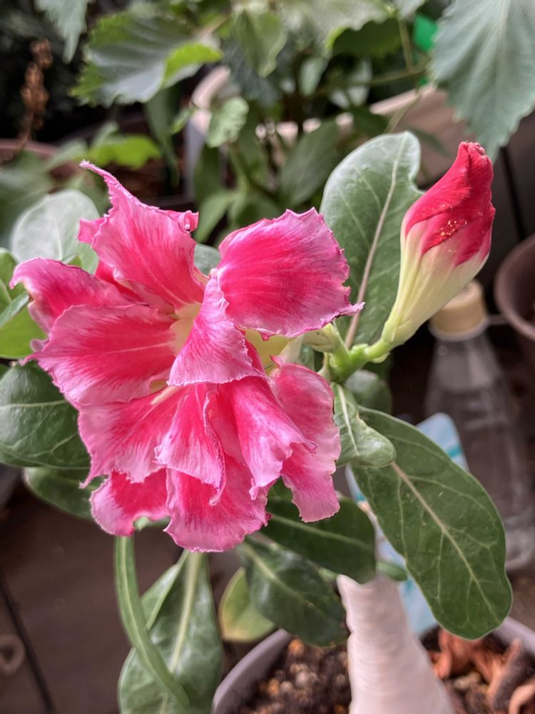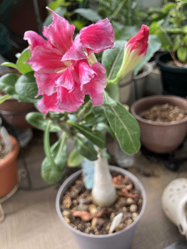 アデニウムさん(砂漠のバラ🌹)が、何度も何度も暑さの為に🥵🥵蕾が出来ては焼け枯れ、出来ては焼き枯れてしまったものが、日除けして、やっと咲いてくれました〜〜❣️