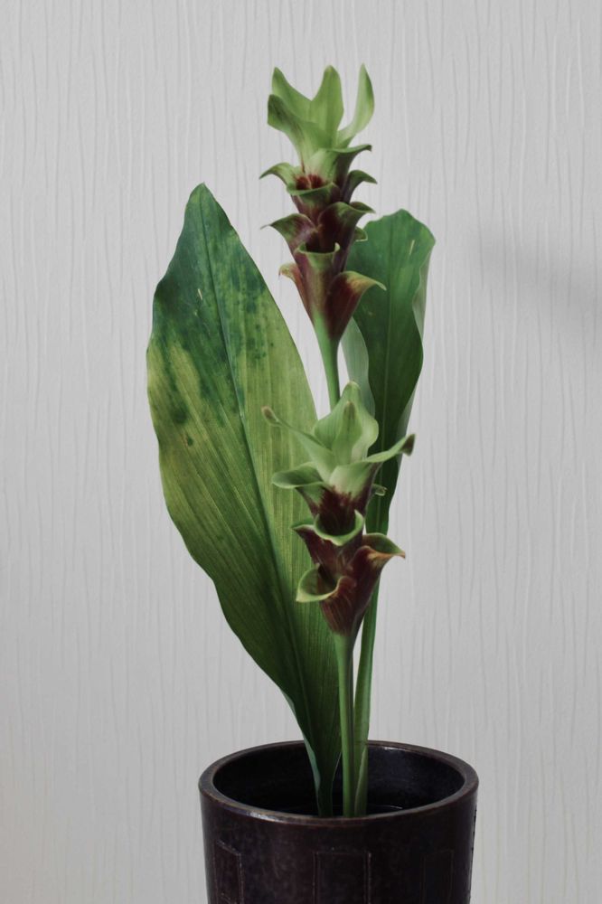 クルクマ活けました。すぐに活けなかったので、葉っぱの色が変わってしまい残念😢