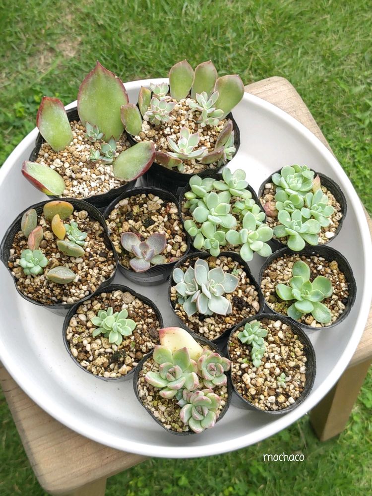前は葉挿しはホント苦手で全然育てられなかったけど黒ポットにして水やりの頻度も多くしたら残るの多くなった気がする🤔大きめトレーで育てると全然育たないんだよ💦やっぱり水をあげる量が足りなかったからかな😅