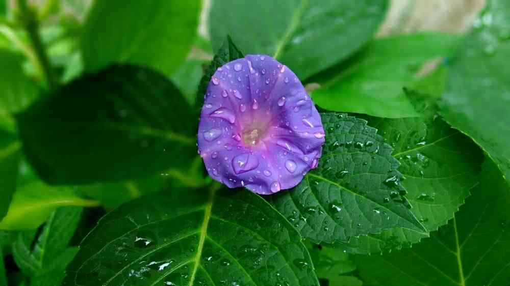 雨の中、紫陽花の葉っぱの中に朝顔が😁