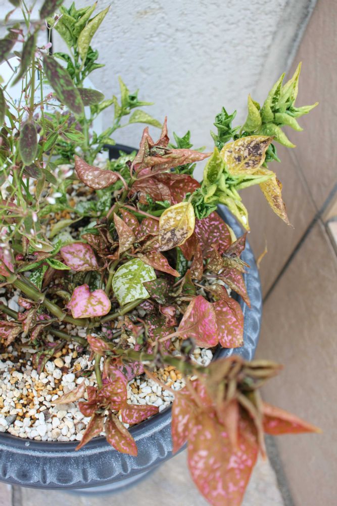 の寄せ植えが、葉も焼けてしまった感じに色が悪くなり、くしゃっとまいた感じに、もしくは蒸れか、調子が一気に悪くなりました😭
