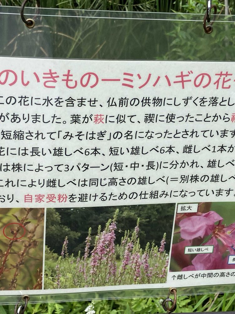 ミソハギの花には長い雄しべ6本、短い雄しべ6本、雌しべ1本があります。雌しべの長さは株によって3パターン(短・中・長)に分かれ、雄しべの位置も異なります。これにより雌しべは同じ高さの雄しべ(=別株の雄しべ)で受粉しやすくなっており、自家受粉を避けるための仕組みになっています。
