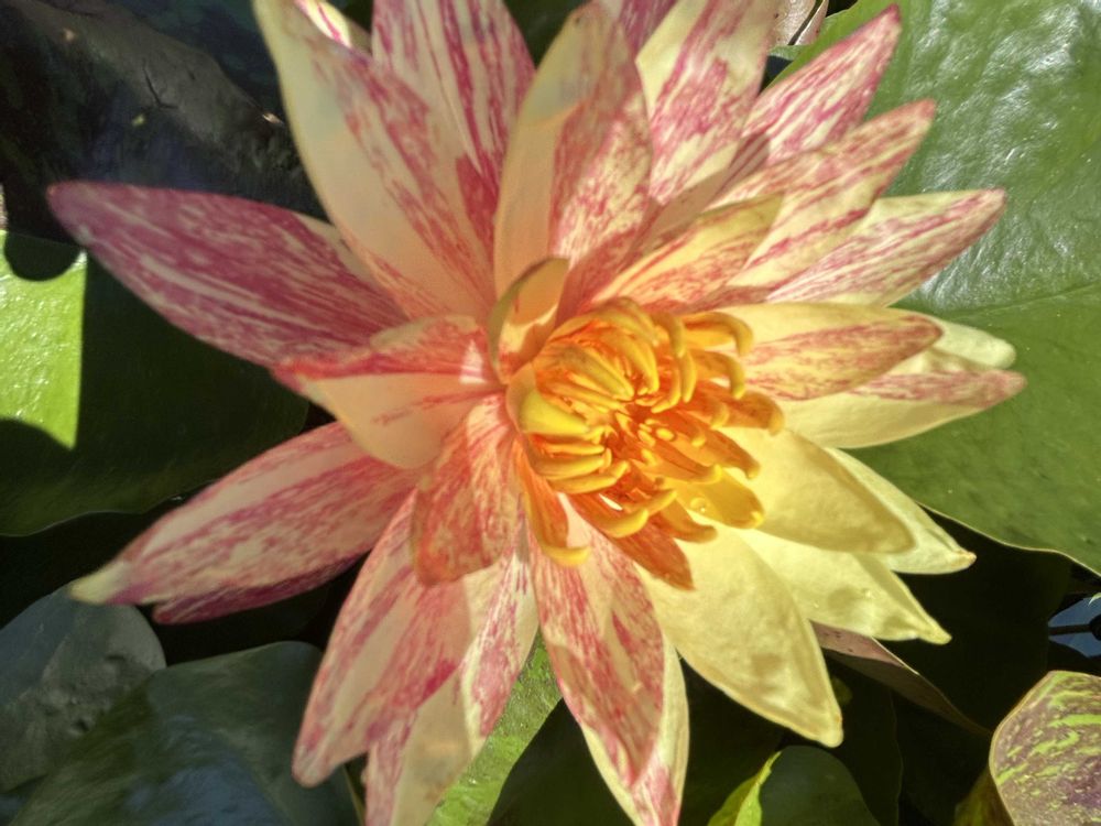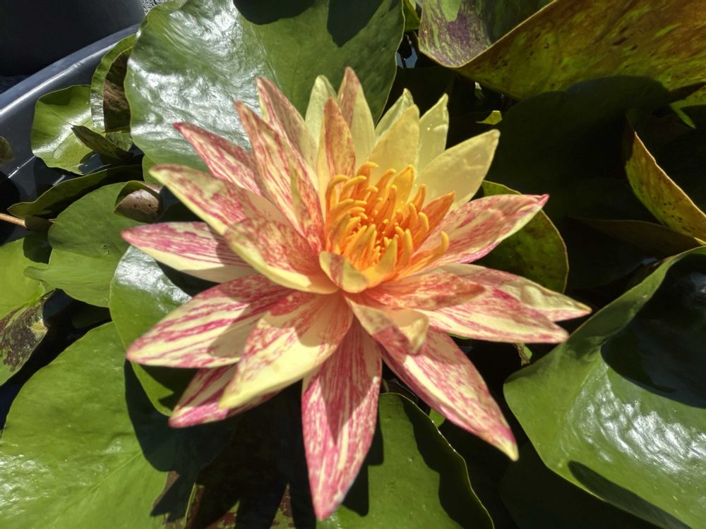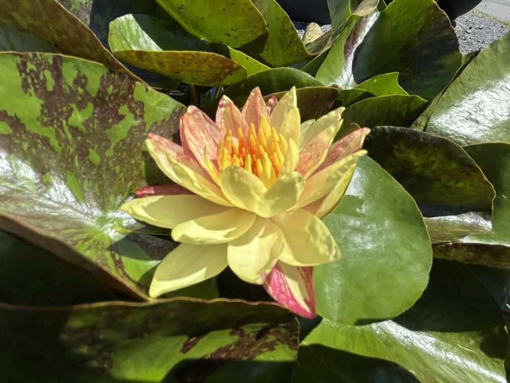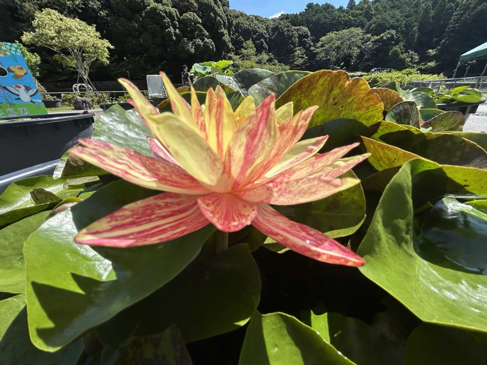 こんちは🤭今日からお盆休みに入りプチ遠で掛川花鳥園に来ております♪お外の樽栽培のクリムゾンファイヤー🔥あのリングオブファイヤー🪷の様なカスリ入りの素敵な品種🪷もちろん初見です🤭控えめな色合いの素敵な品種です‼️