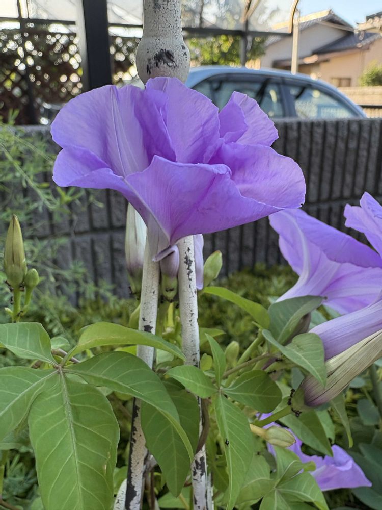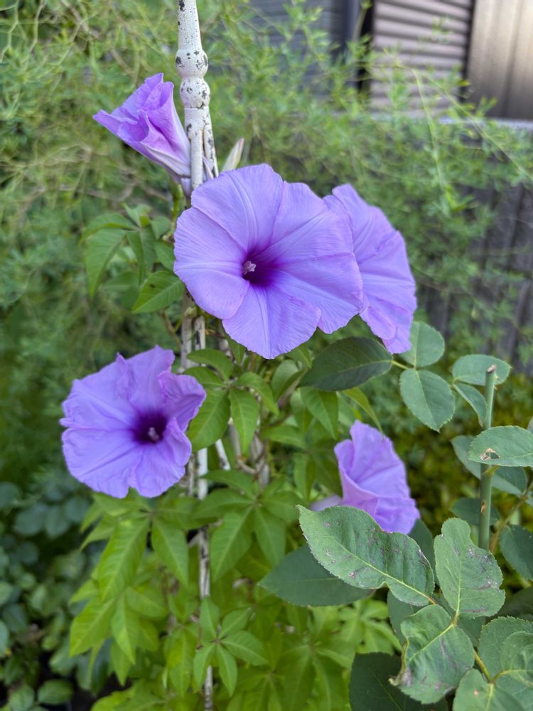 モミジバ琉球朝顔が支柱に挟まれて変な咲き方してます