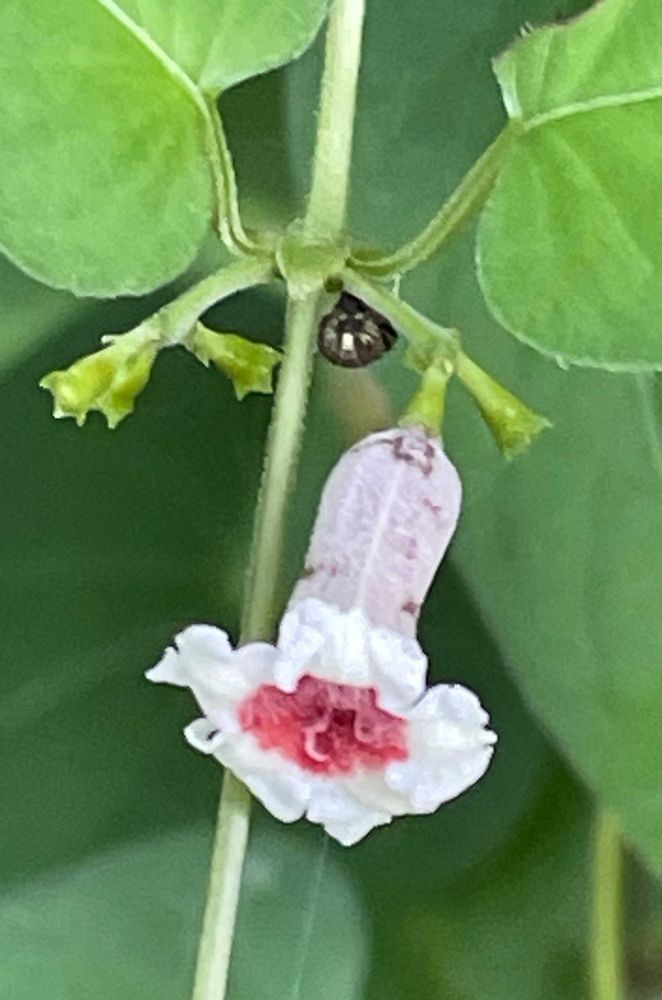 夏に中心部が赤紅色の白い小花を咲かせる花茎5mm位です。