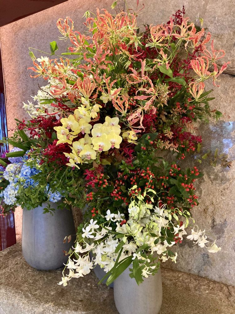 "ザ・ペニンシュラ東京"丸の内仲通り出入口のホールの装花と外の寄せ植えプランター。