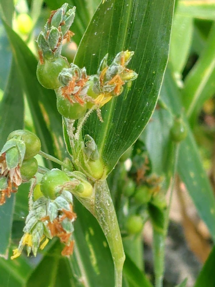 雌花の小穂は固い苞に包まれた花穂で、柱頭だけを外に出し、雄花の小穂は苞を貫いて伸びて雄しべを垂らす。