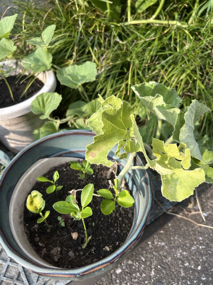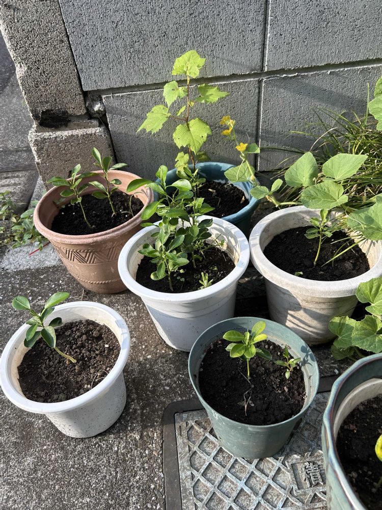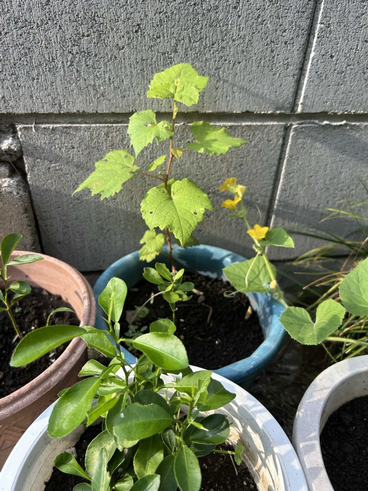 沢山の柚子と、たぶんメロンとたぶん葡萄。3枚目、葡萄だろうなぁと思ってますが、フルーツパックに入っていた種をそのまま蒔いて放置してるので、もしかしたら葡萄じゃないかもしれないです。