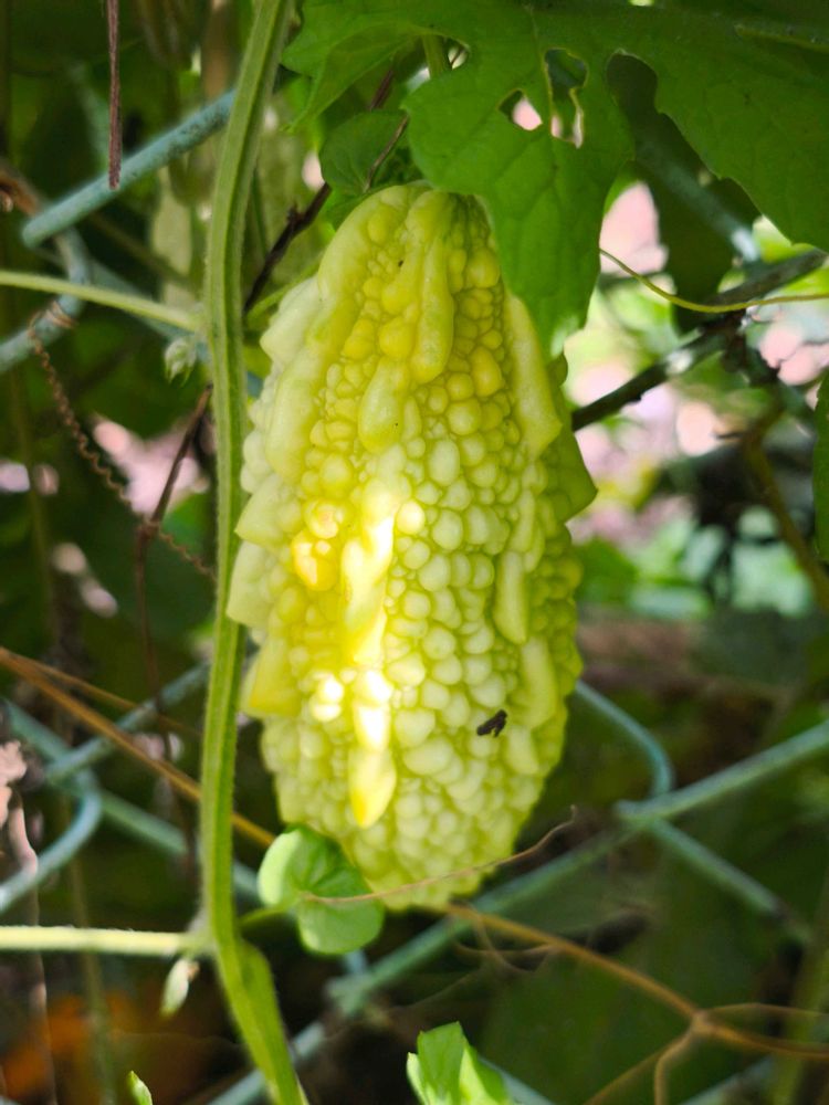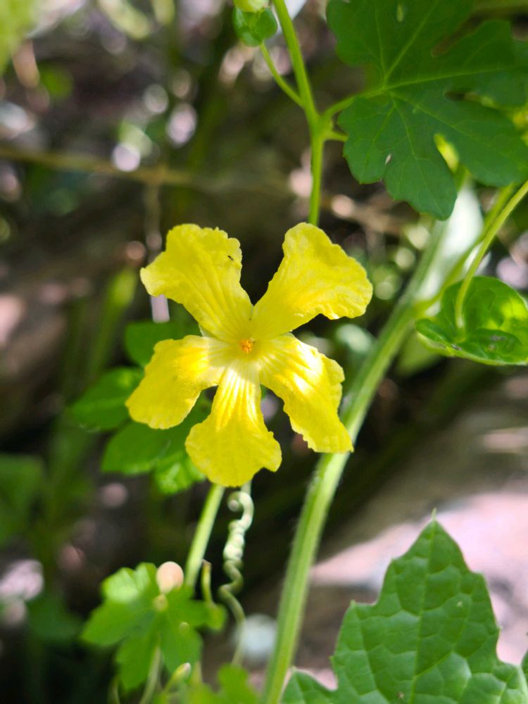 里山の畑の柵に生えたゴーヤが花が咲き実になっていました。