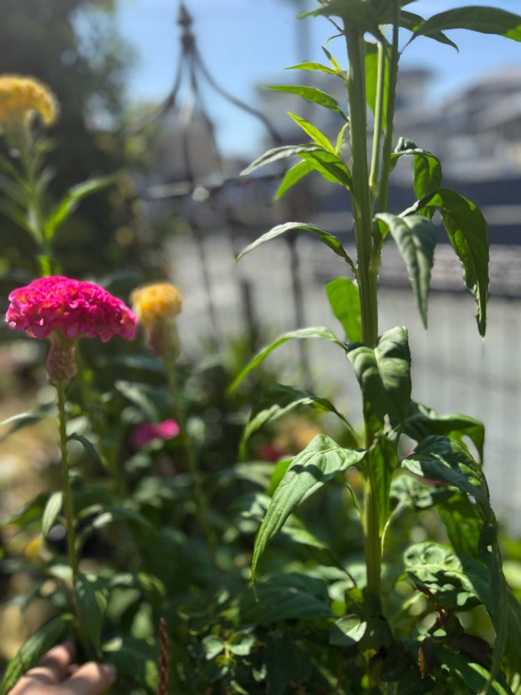 ケイトウ100キンのなんだけどイエローとピンクで赤はないんだけどだんだんトサカみたいにモコモコしてかわゆいくなりました。