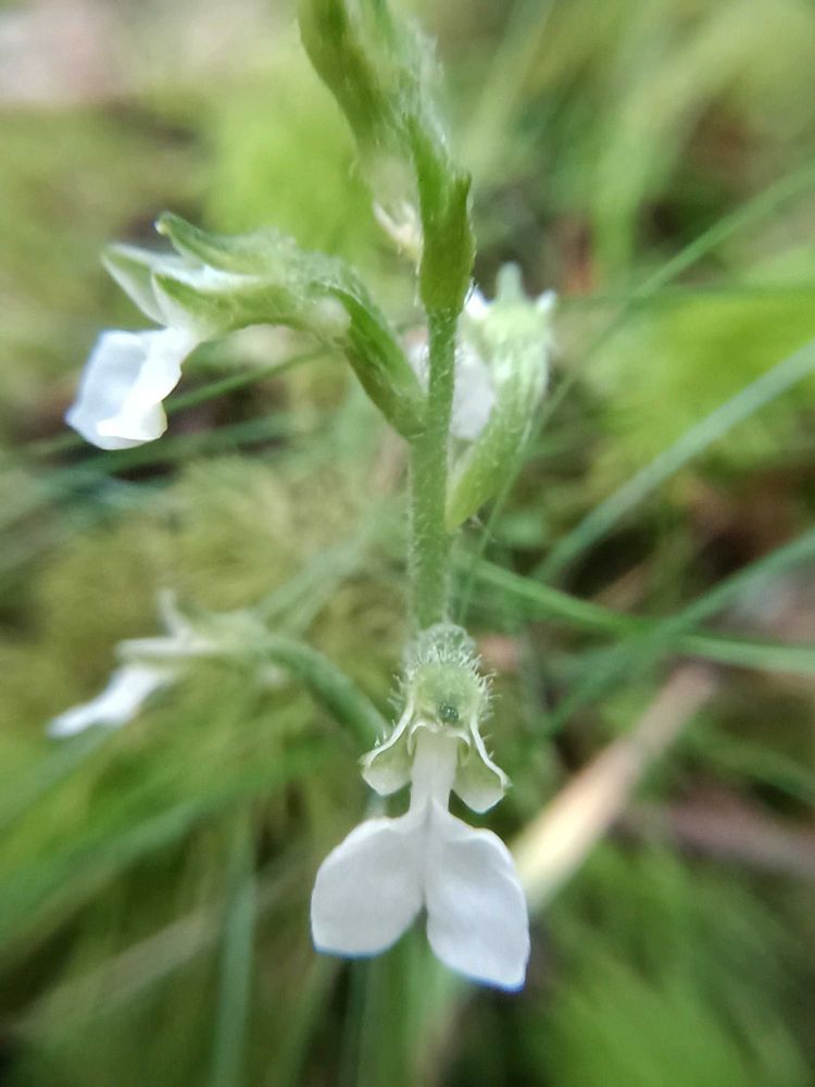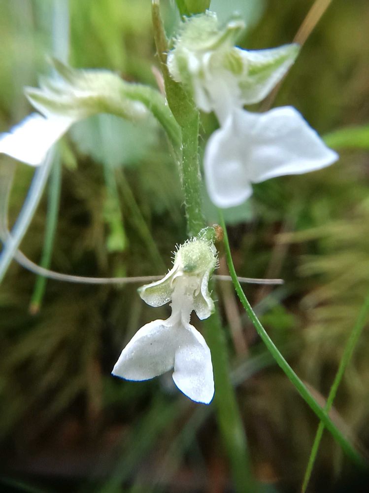 7~8月、直立した茎の先端に1~4個の白色の花をつける。子房、苞、萼片は細かい軟毛がある。側萼片の基部は合着してふくらみ、唇弁の基部を包む。唇弁の先端は長楕円状四角形となる