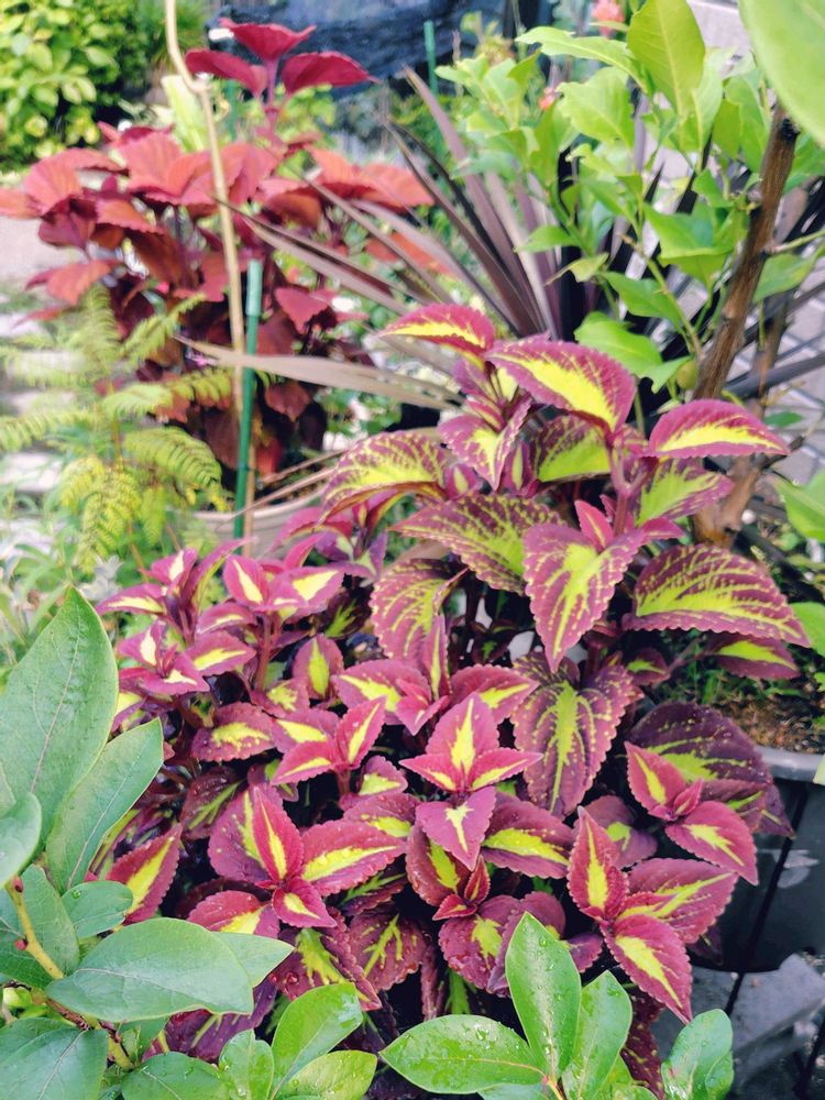 今、コリウスの新旧葉の模様が、楽しめる姿になってます(手前)。