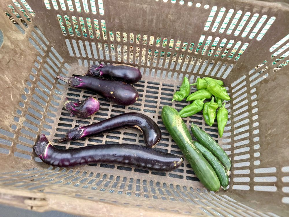 今朝の収穫です🥒ナスとピーマンはかなり茂っていたので剪定し、キュウリはまだ収穫が見込めそうでしたが、秋冬野菜の準備で片付けました。今朝は比較的涼しかったです☁