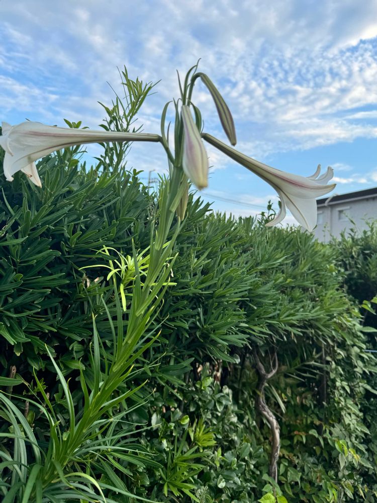 買い物帰りに、農家さんの畑の垣根の間から私の身長(159㎝)よりも高いタカサゴユリが顔を出していました。