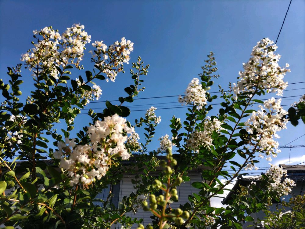 今日の花『サルスベリ』わが家のサルスベリ。毎年、真っ白🤍🌿の花を咲かせてくれます。青空に映えますね。昨日夕方16時51分のシャメです。