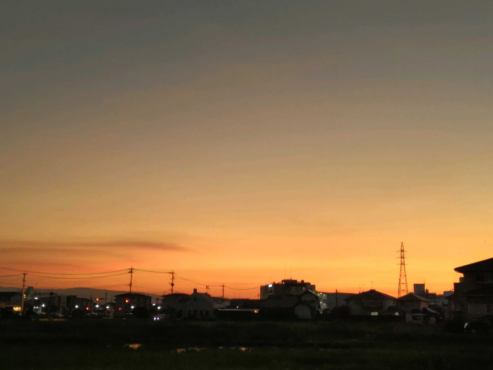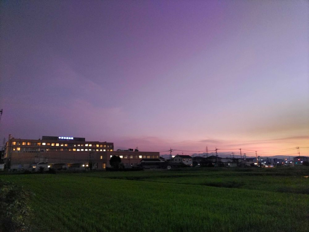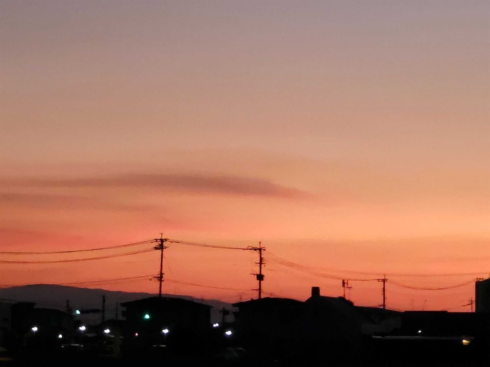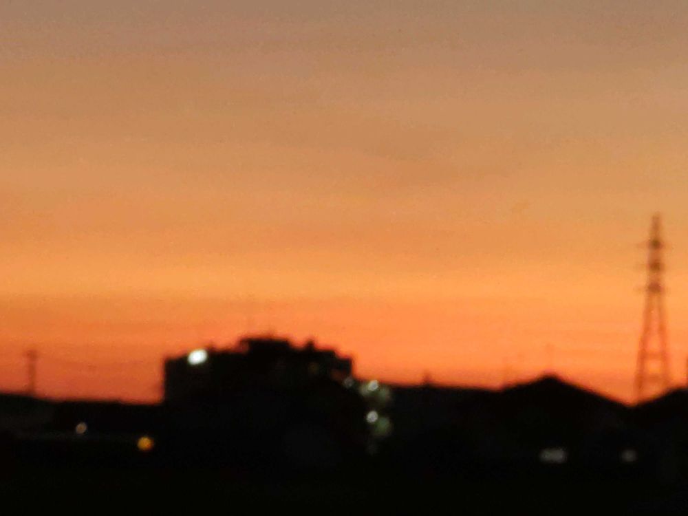 又、一昨日木曜日の夕方遅い19時26.27分のシャメです。夕焼けが綺麗でしたので、撮りためてました。夕陽も大好き💓、スマホ片手に、近所の夕陽、青紫に市民病院が写ってます🙆✌️。
