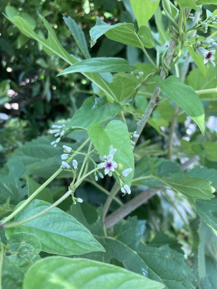 庭を見ると屁糞葛が咲いてました。すり潰すと強い臭気を放ちます。花期に全草を乾燥させた物を鶏屎藤と言い脚気、黄疸に薬用します。生の実をすり潰し肌に付け赤切れ、霜焼けに薬用します。