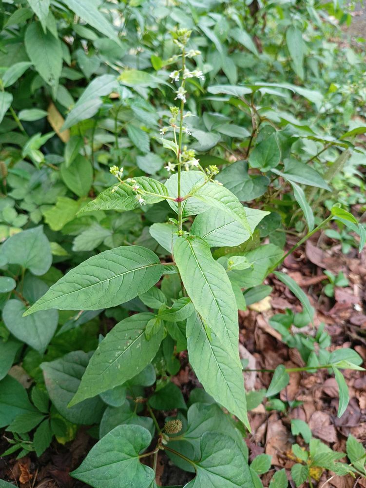 北海道〜九州の山野の木陰などに生える。高さ20〜60cm。茎には下向きの毛が生え、節は赤褐色を帯びることが多い。葉は対生し、長さ5〜13cm、幅1.5〜4cmの長卵形〜卵状長楕円形で先端はとがり、ふちには浅い鋸歯がある。茎の先や上部の葉腋から花序をだし、白色または淡紅色の小さな花をつける。花弁は2個で2裂する。堅果は直径3〜4mmの広倒卵形で、カギ状に曲がった毛が密生する。花期は8〜9月。