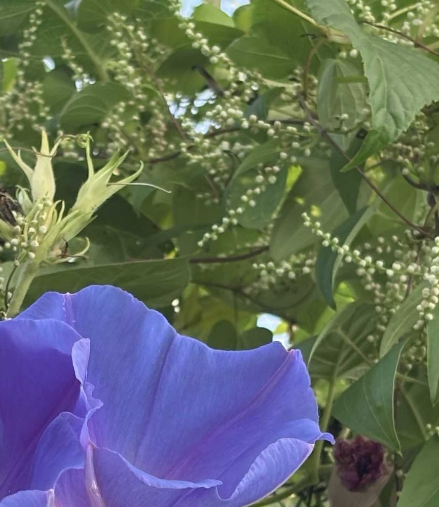 山芋のつると絡み合って、、南天や黄梅に身を任せています。モジャモジャ😓。