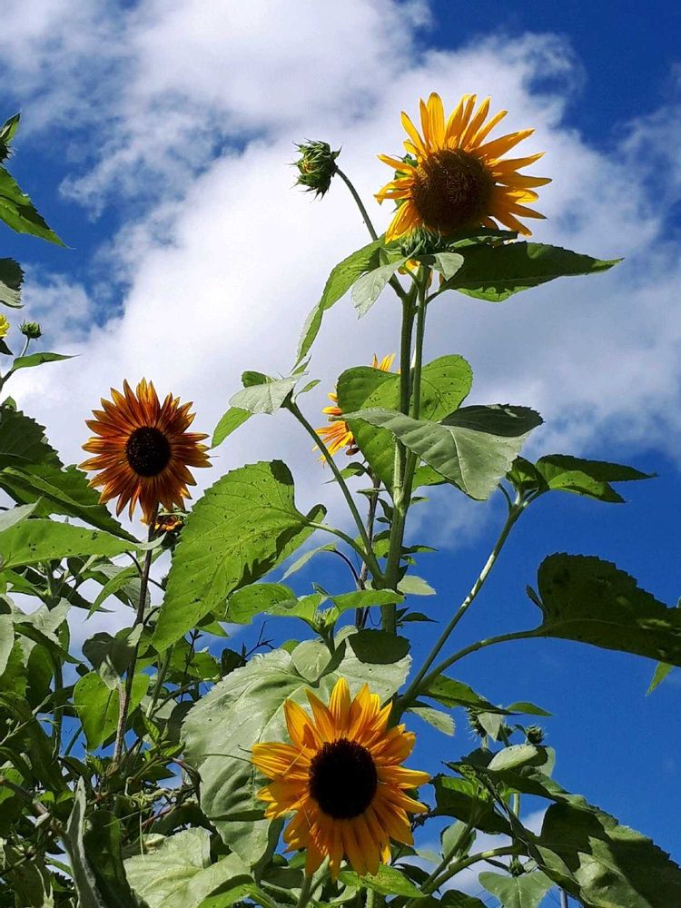 空に向かってまっすぐ逞しく、力強いひまわりですね🌻