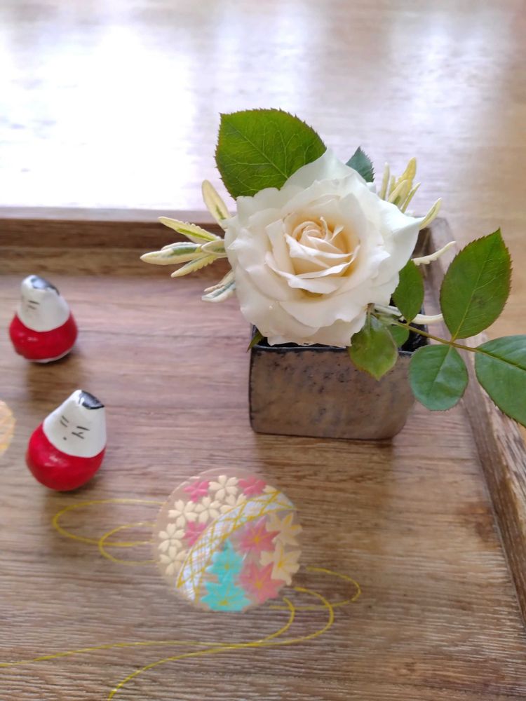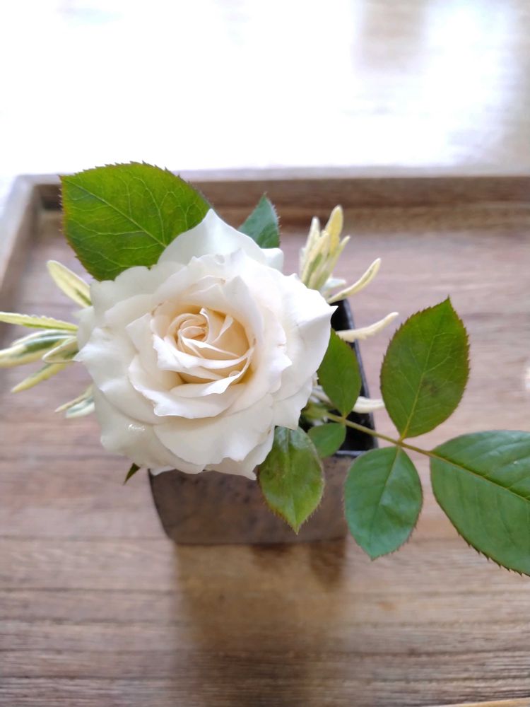 薔薇1輪でも綺麗ですけど、日々先生のご指導を受けている私ですもの、そこにどんな物を合わせたら、もっと素敵になるか、考えましたよ~🤭