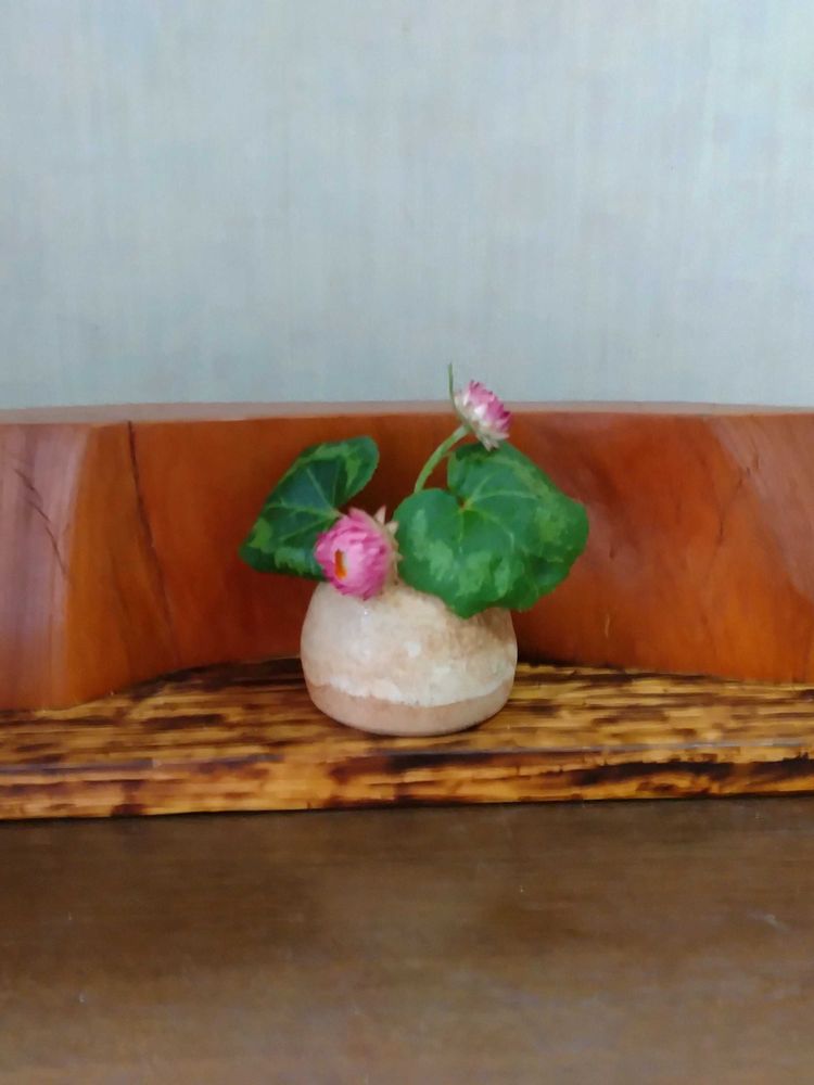 3)帝王貝細工とシクラメンの葉を小さな益子焼の器にいれました。