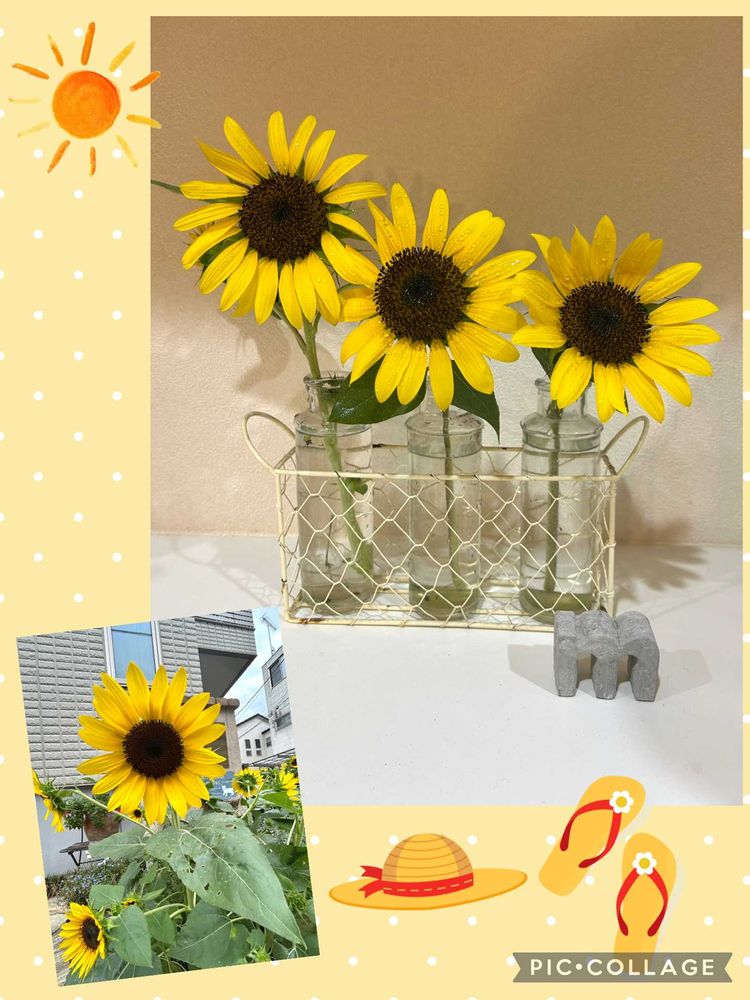 ひまわりのサイズも3本それぞれにちょうど良くて〜🌻🌻🌻