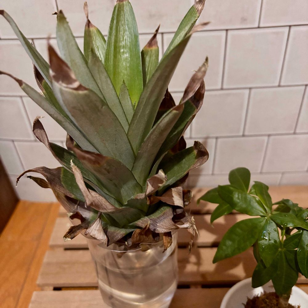 前に食べたパイナップル🍍の頭の部分をカットして乾かして水栽培😆