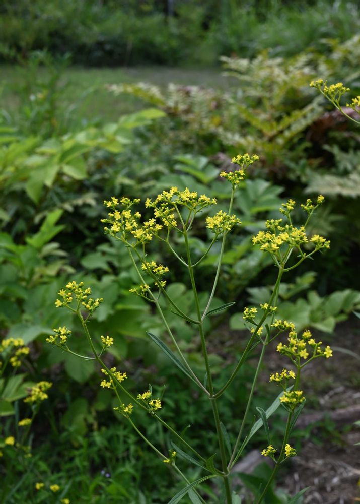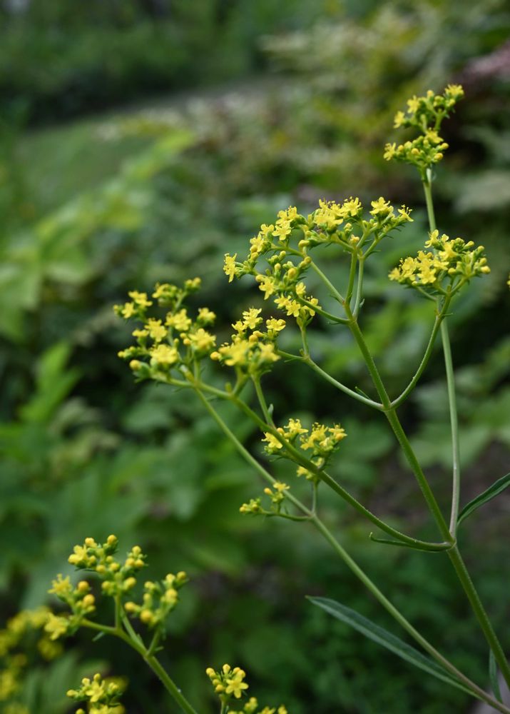 花茎の先端に黄色い小花を平らな散房状に多数咲かせる。