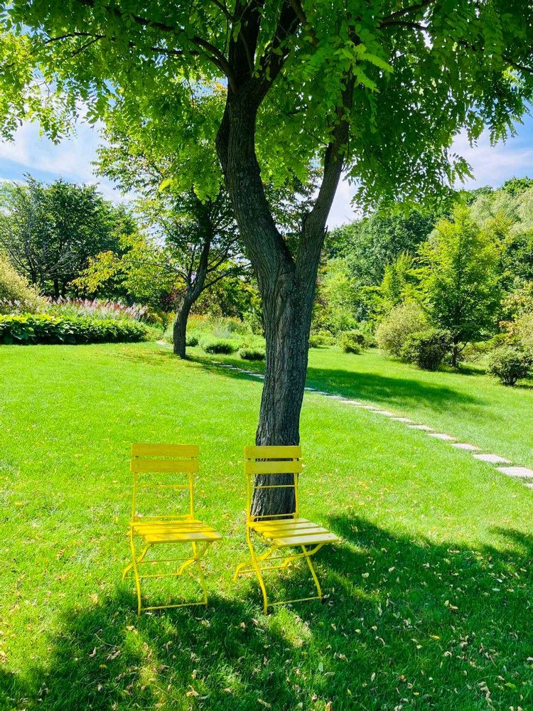 芝生に黄色の椅子が2つ、ポスターになりそうなオシャレなシーンですね✨