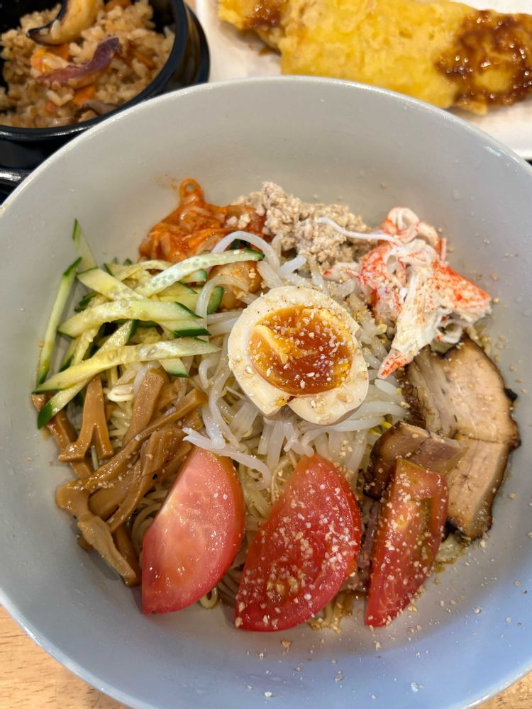 ②外に出ると、この季節はついつい冷たい物を頼みがち。この日は冷やし中華とタコ飯と穴子の天ぷら〜😋✌️ もう少し量を減らさないと、おデブになっちゃう〜😱 あっ、もうなってたわ😑🤚ブヒッ