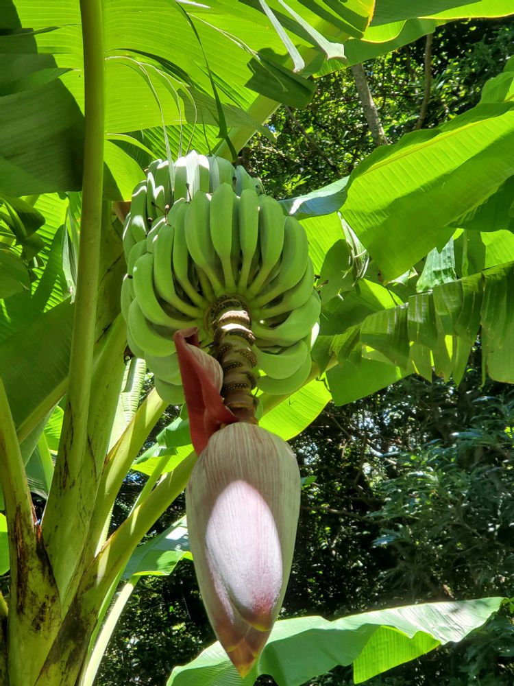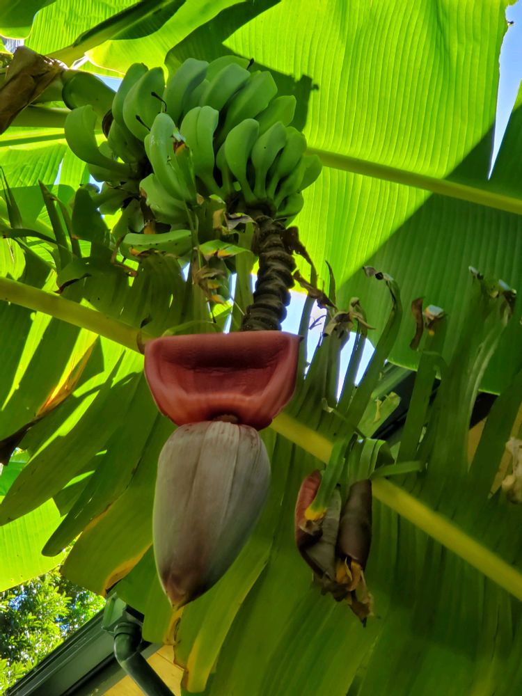 バナナ(調理用)が出来てました。背も屋根を超えてきた。 昨年は、台風で倒れたり、未成熟でダメでしたが、初めて食べられるバナナが出来そう🥰