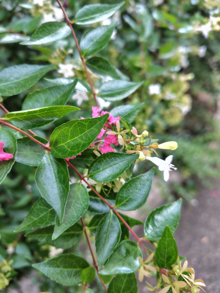 ④…白いアベリアの植え込みの中に、濃いピンク色の花…⁉️