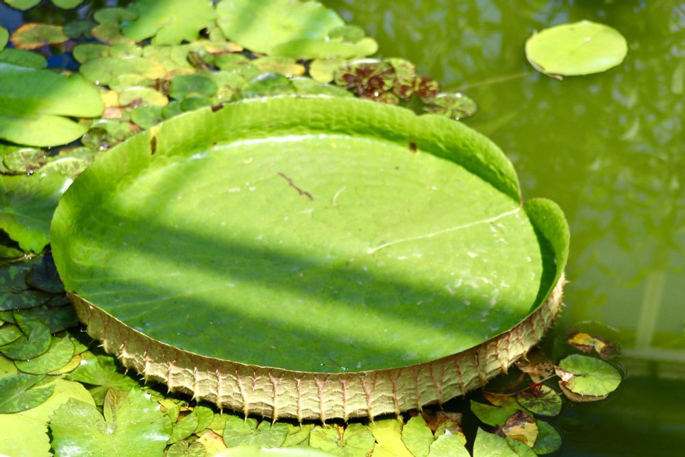 葉は、巨大なものは、1〜1.5メートル葉縁は高さ15〜20センチに立ち上がります。子供たちが乗ることもできるそうな😆