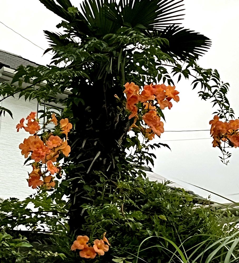 お盆に帰省したら、ノウゼンカズラが、こんなふうに、シュロの樹に巻きついて咲いていました🍀*🧡 どこまで伸びるかな(*^^*)