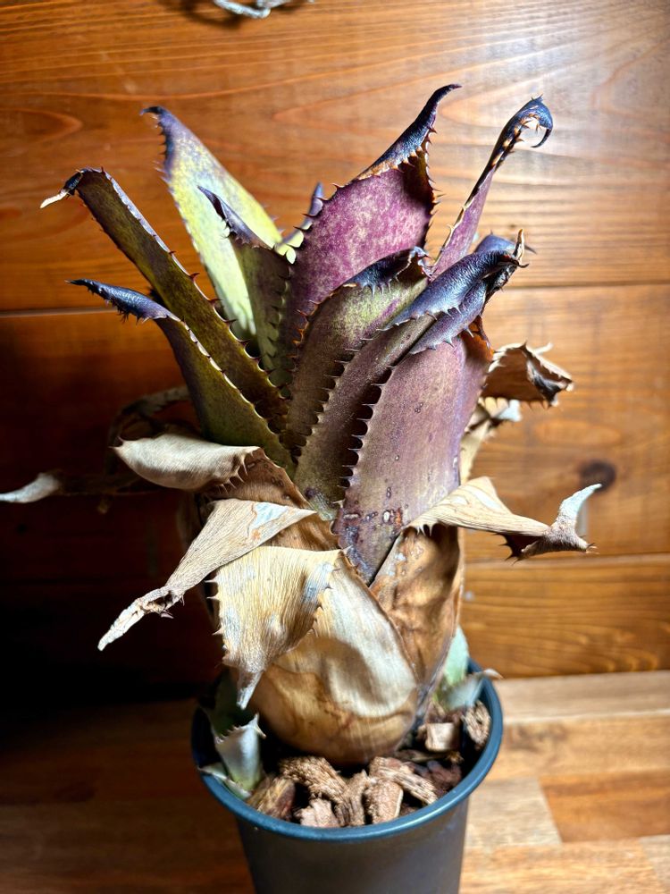 ホヘンレゲリア、ホヘンベルギアとネオレゲリアの交配種らしい。鋭く黒い鋸歯に紫とミントの配色がカッコ良い。子株がたくさん出てきたので来年大きくなったら収穫しよう。この子を手に入れた時に子株からが本番と言ってたけど。タイのファームから来た状態より日本の気候で育った子の方が良い成長が期待できるってことか。