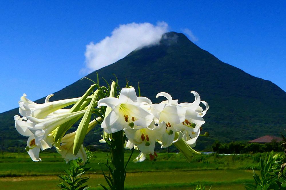 タカサゴユリ越しに、薩摩富士開聞岳です🎵
