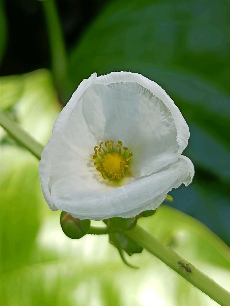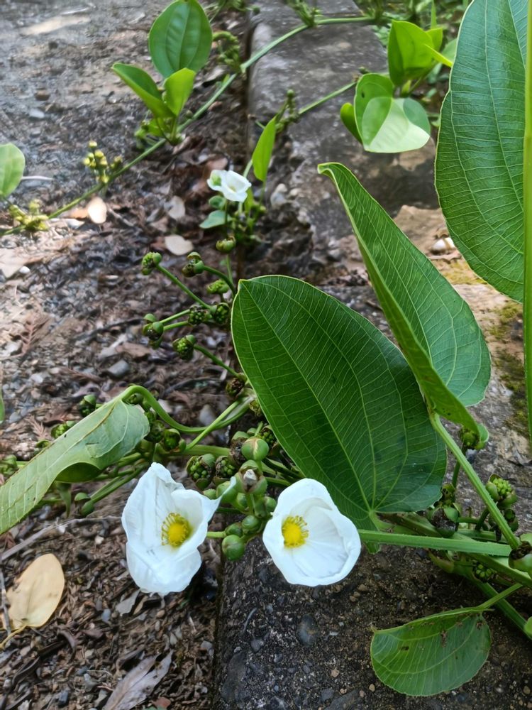 直径3cmほどの白い花が、緑の葉に映えていました。葉は大きく、茎が蔓のように伸び、透き通るような薄い花弁が上向きに点々と咲いていました🤗
