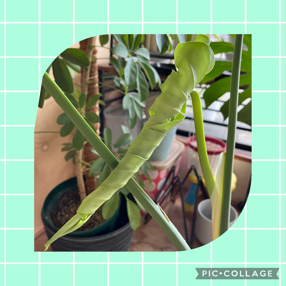 えぇ〜😳モンステラの葉っぱって小さい切れ目の無い葉っぱ🌿が段々育って切れ目が出来ると思ってたけど 巻いて育つの?それとも夜だけ葉っぱを巻くの?🫣