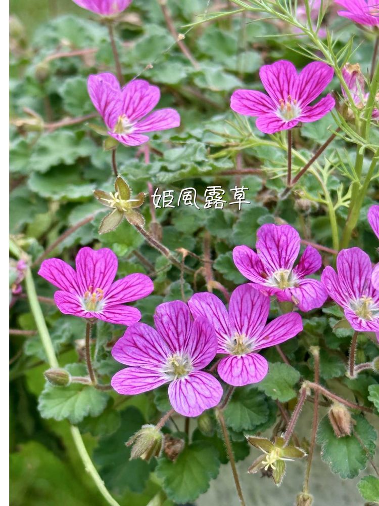 ヒメフウロソウは、フウロソウ科オランダフウロ属のごく小型の多年草で、マヨルカ島とコルシカ島の山岳地帯に分布するレイチャルディ-(Erodium reichardii)とコルシカ島に分布するコルシカム(E. corsicum)の交雑種と言われています。この属の中では、オランダフウロ(E.cicutarium)が江戸時代に渡来していますが、今は栽培されていません。
