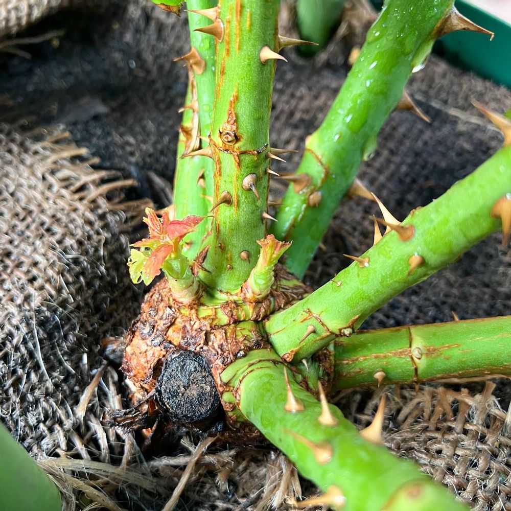 土曜日に早めの夏剪定を行なった新苗のフランシスバーネット。剪定三日目にしてベーサルシュートが出てきました。芽接ぎ苗の細っちい2本の枝だった春の姿からは想像つきませんww