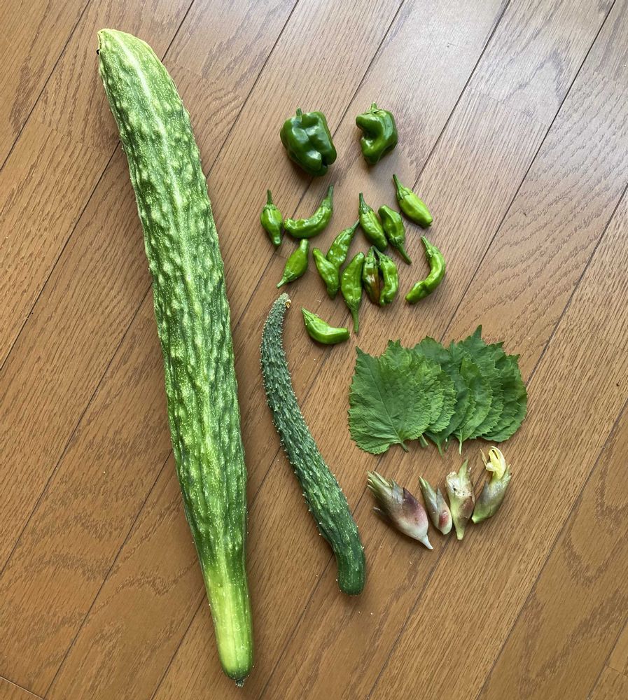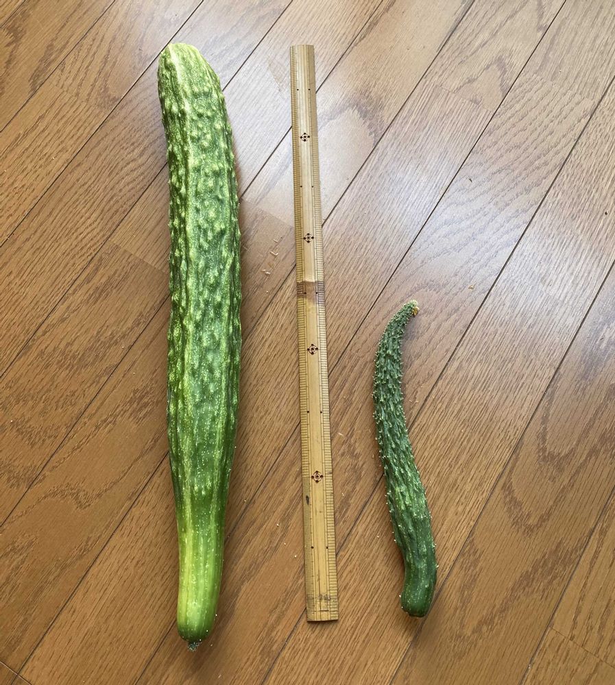 お隣さんのフェンスを超えて収穫し損ねていた巨大キュウリ!(◎_◎;)