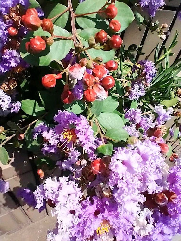④ご近所さんの玄関先、💜紫色の矮性サルスベリ 3年ほど、ほぼ同じ大きさで〜✌🏼