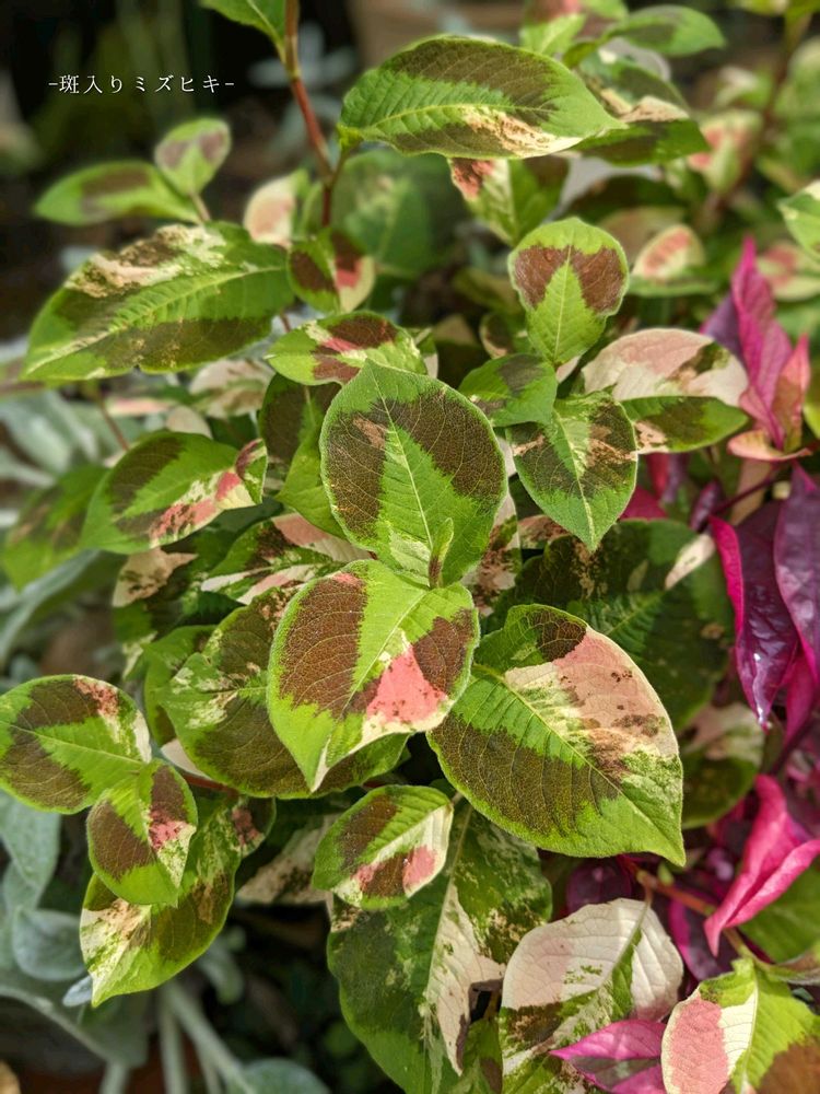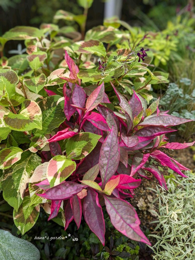 こぼれ種の斑入りミズヒキと寄せ植えにしています