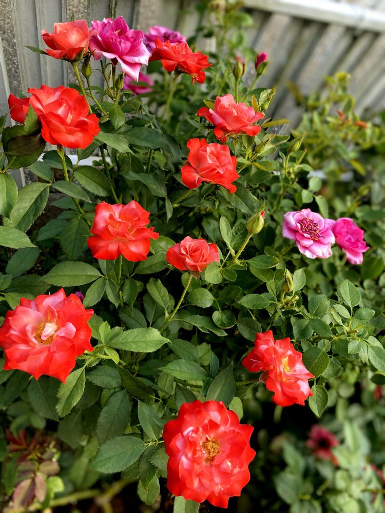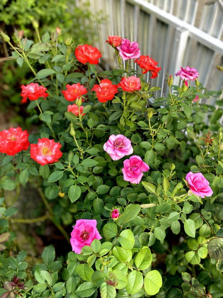 一日陽がが当たる南側、この猛暑の中すっごく咲いてる😳🌹💦いつもは夏のバラは咲かせず蕾を切るのですが、今年は葉っぱもフサフサ生き生き、病気もないので、地植えの方だけ咲かせました。