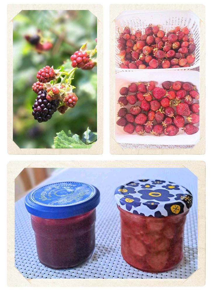 ① 毎日黒く熟したのを収穫しているブラックベリーのジャムと、6月に収穫して冷凍しておいたイチゴで作ったジャム